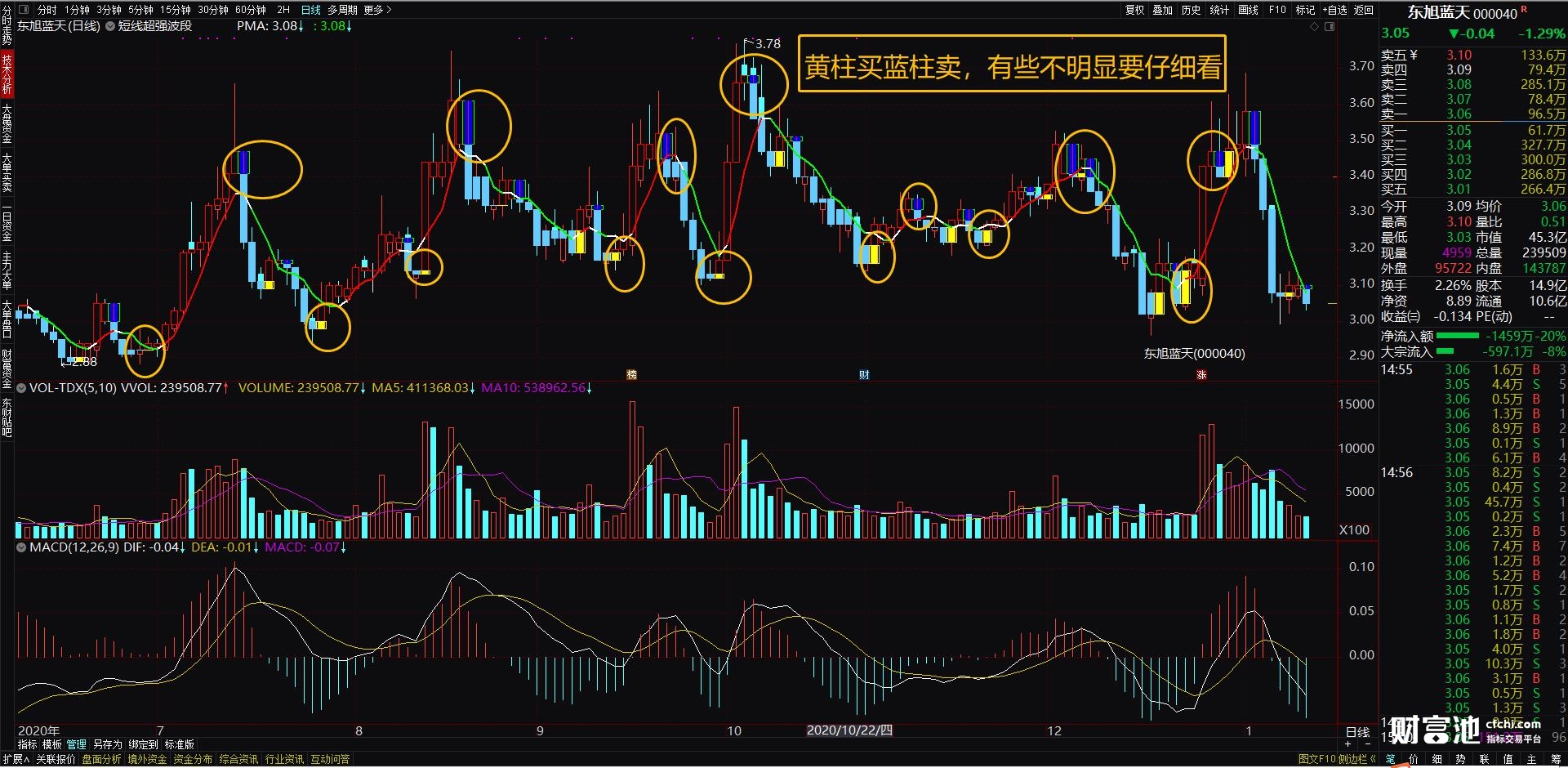 4、指标详解:看主图,黄色柱子出现就买入股票,蓝色柱子出现就卖出股票。