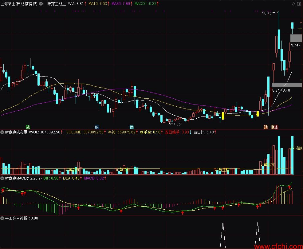战法原理及目的:指标在均线基础上增强了MACD、趋势理论、量能。一阳穿三线是股价强弱关系转换的临界点的一种表达,也是中线,短线,长线资金的一个共振点。实盘结合资金,大盘环境,实操性非常的强。