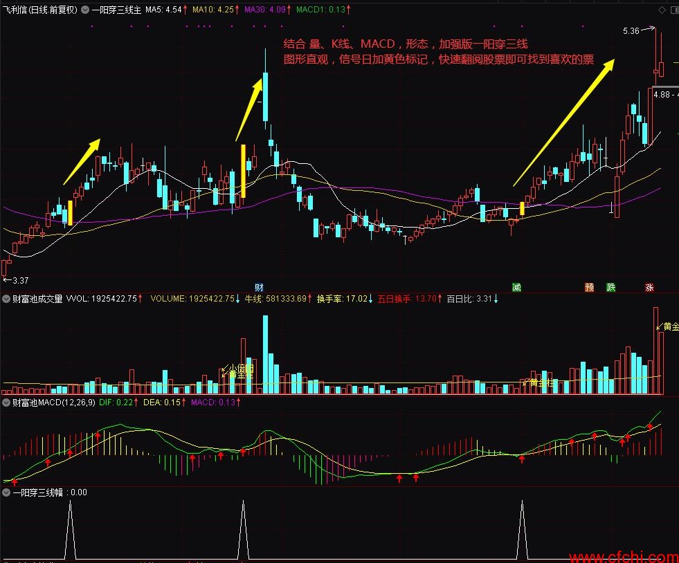 指标内容: 包含一阳穿三线主图、一阳穿三线幅图、一阳三线选股公式