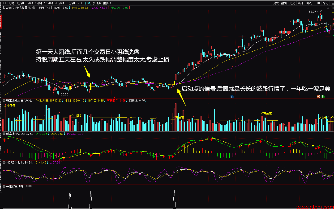你现在看到的是一个经过长期实战,验证的一阳穿三线主图/选股指标。如果你又一定的炒股经验,可以如虎添翼。如果是新手,这个也非常适合你。图形识别度高,简单。
