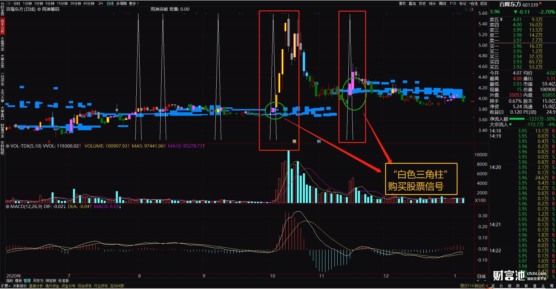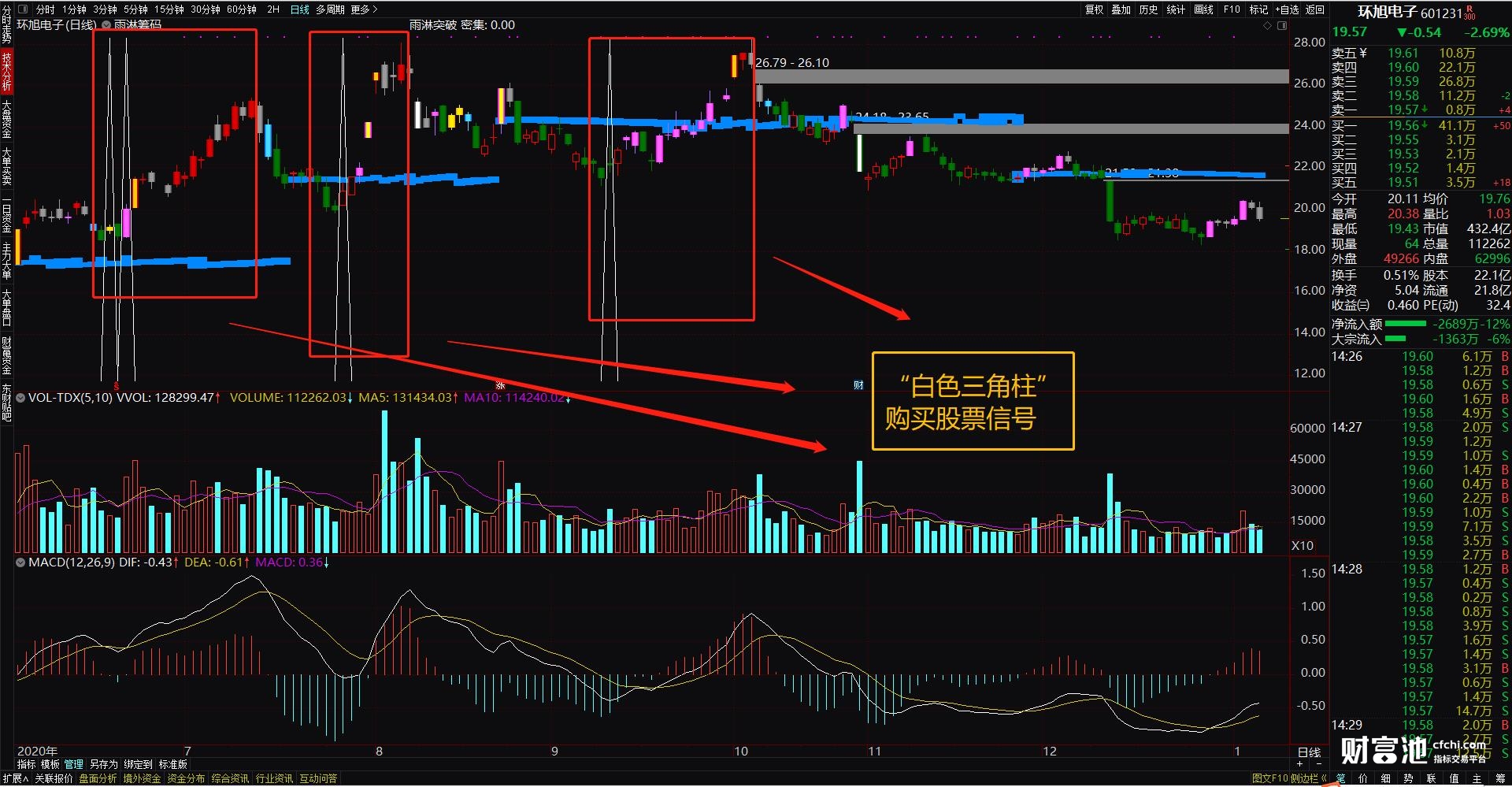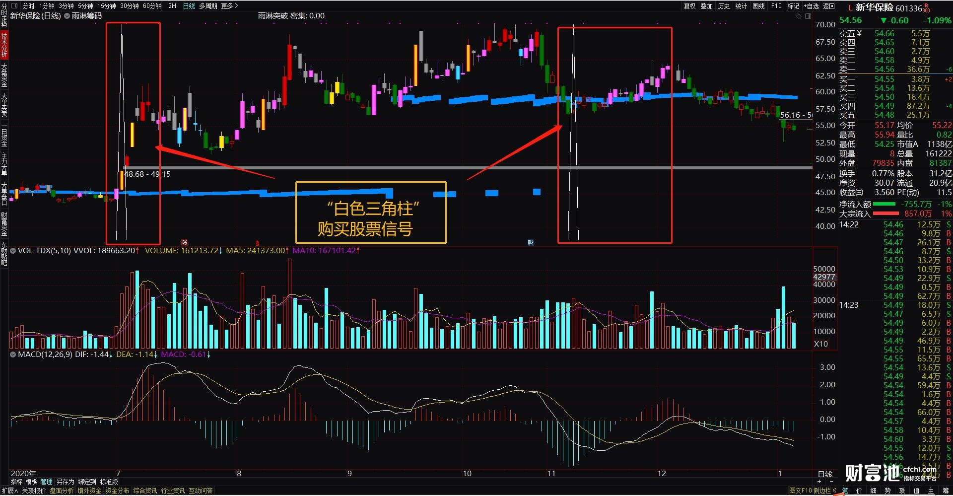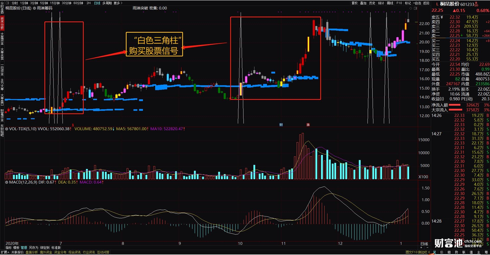 主图上出现“白色三角柱”就购买,此时就是最佳的突破买入时机了。