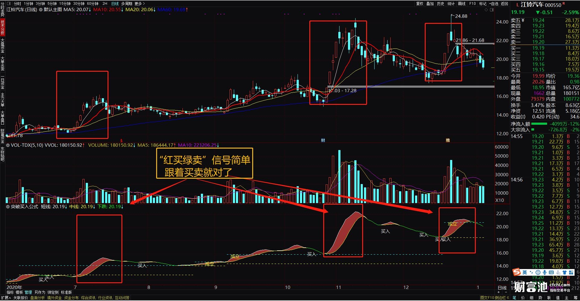 红色波段就买入股票,“买入”两字是购买股票的最佳时机,绿色线出现就要卖出股票。