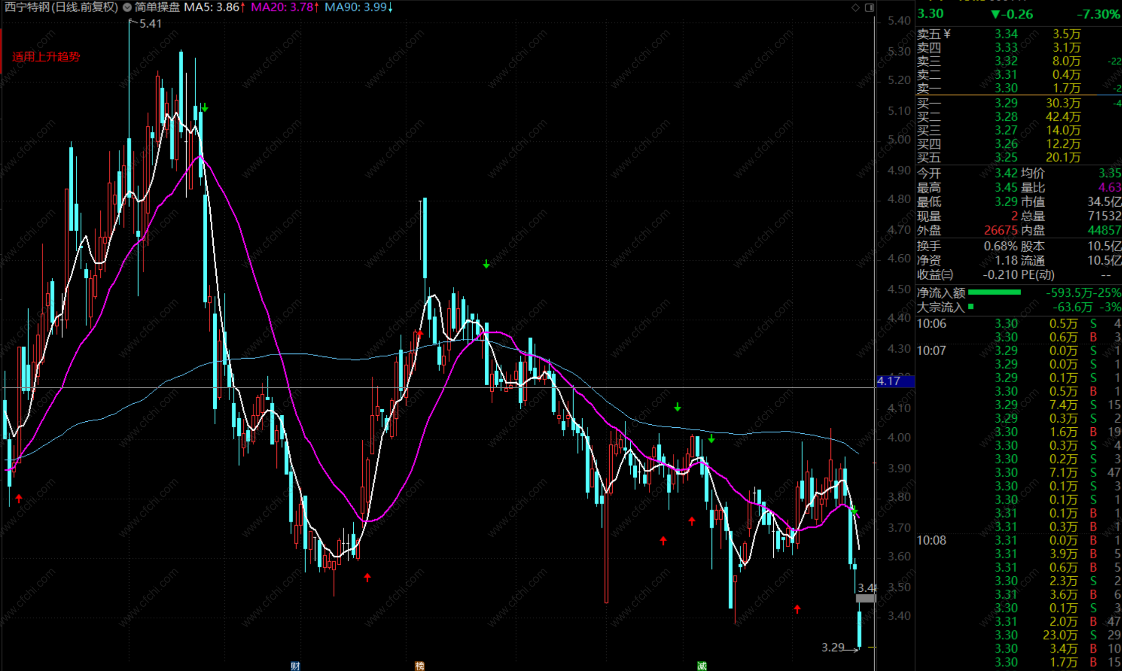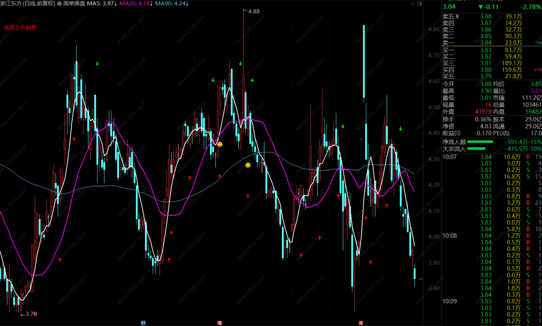 不求买在最低点,不求卖在最高点,只求中间有肉的那段。红箭头买进,绿箭头卖出,操盘就这么简单。适用上升趋势,震荡、下跌趋势慎用,附图: