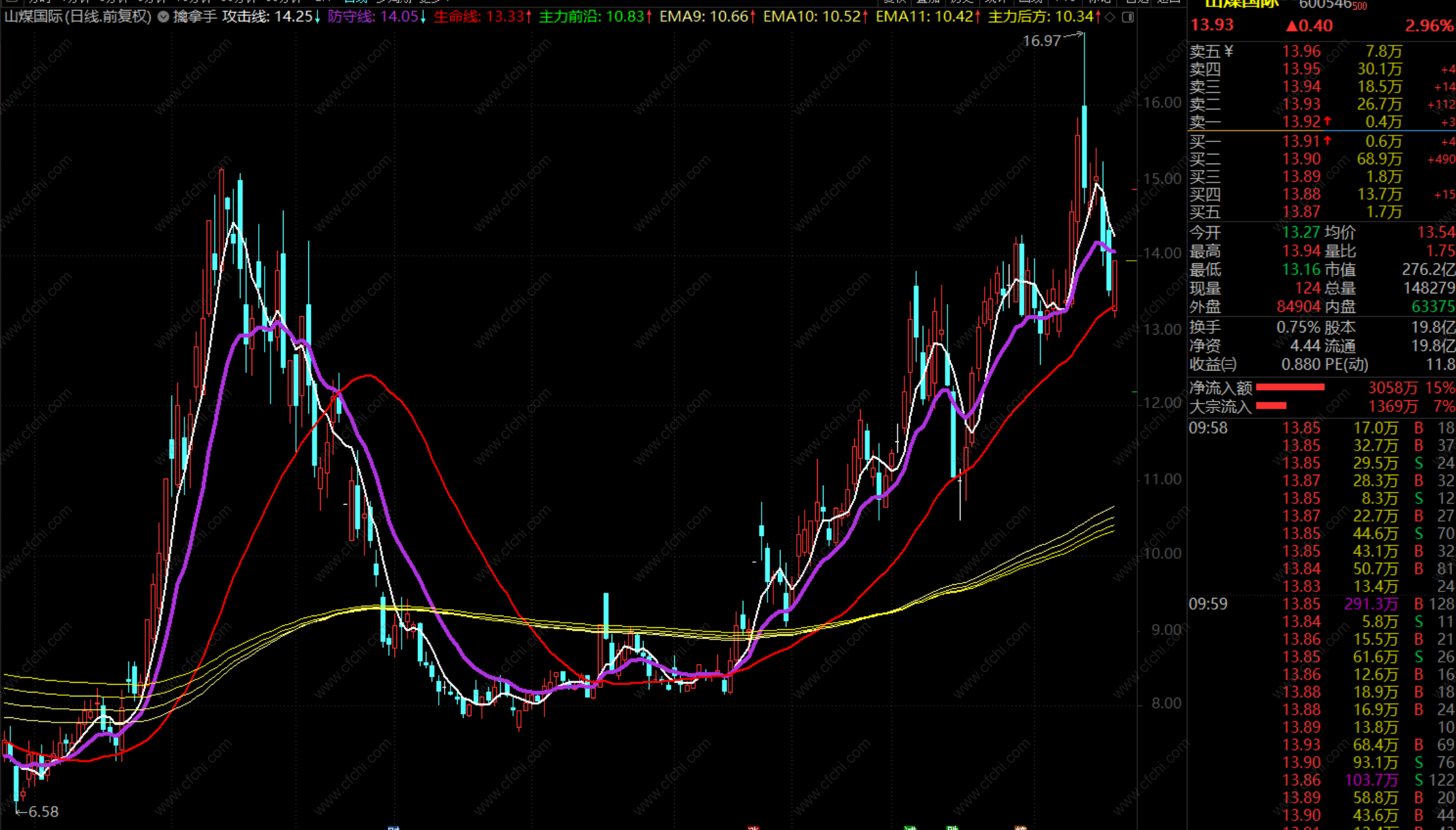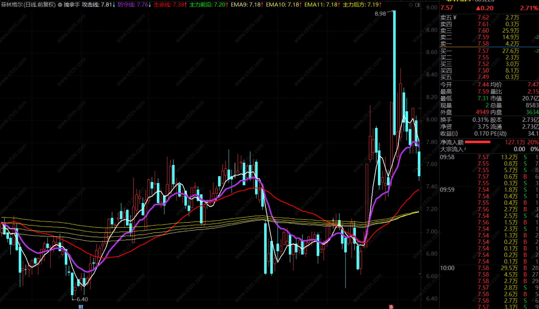 擒拿手的运用简单说明: 我们的擒拿手把繁杂的均线统一成三根均线,分别为,攻击线(白色线)防守线(紫色线)生命线(红色线)