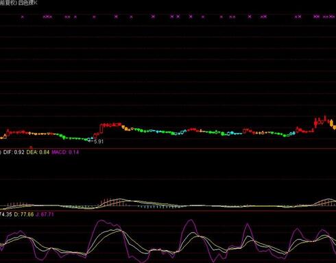 本指标是将经典指标MACD与KDJ组合的四种状态直接反映到K线的四种颜色上,让使用者仅通过主图K线就能看到更丰富准确的信息。这个设计思想看似简单,但反映出来的东西却可说是深刻的,直观的,有时会发现过去看不到的东西,对使用者操盘非常有利,而且也可作为基本素材再构指标。