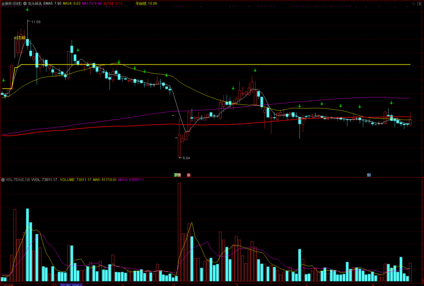 龙头战法主图里面主要用到平台线和龙行线 潜伏黄柱和红色箭头持股 绿色箭头卖出,平台线又称涨停过河线 意思就是过了线往往会出现涨停,使用龙行线寻找启动板块及个股。