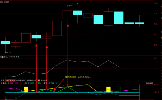 另外,当绿色出现的时候,代表我们可以全仓买入了,这时候实际已经成熟,黑马股正式迎来上涨期