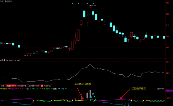 最后,还有一点比较重要的是,当我们看见蓝色线的时候,记住这是主力要清仓的时候,这时候我们要立刻下马,所谓下马就是赶紧走人!绝不回头!千万不要再玩了!