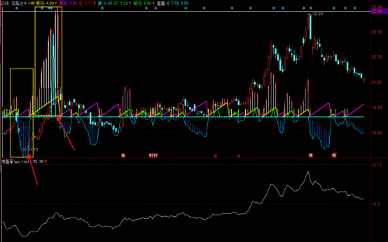 当我们看到黄色线的时候,证明这只股票是可以持有的,当我们看到粉色线出现的时候,我们就要警惕了,这时候千万不要进仓。