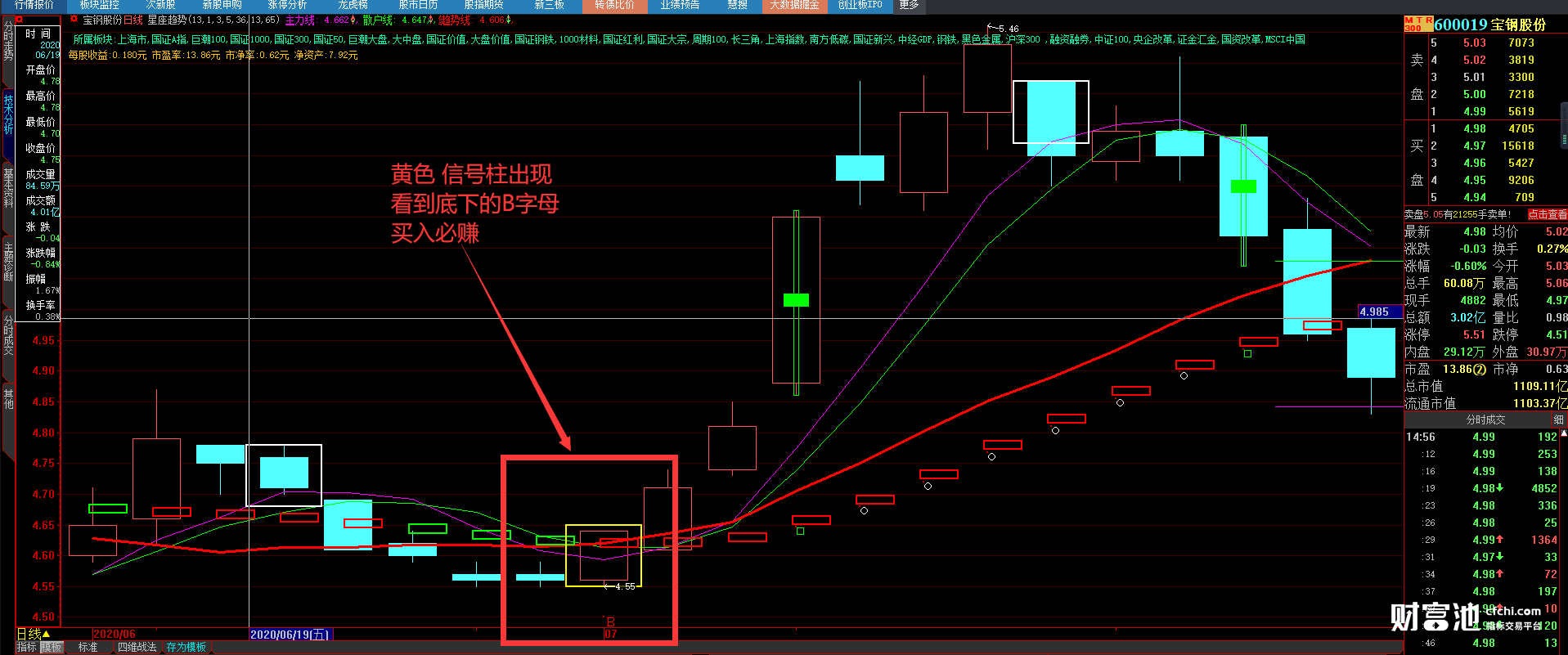 出现黄色信号柱,可以看到下方有个B字,意味着这个可以买入。