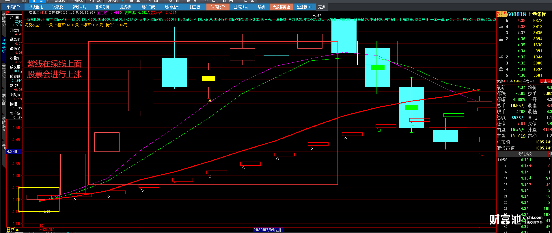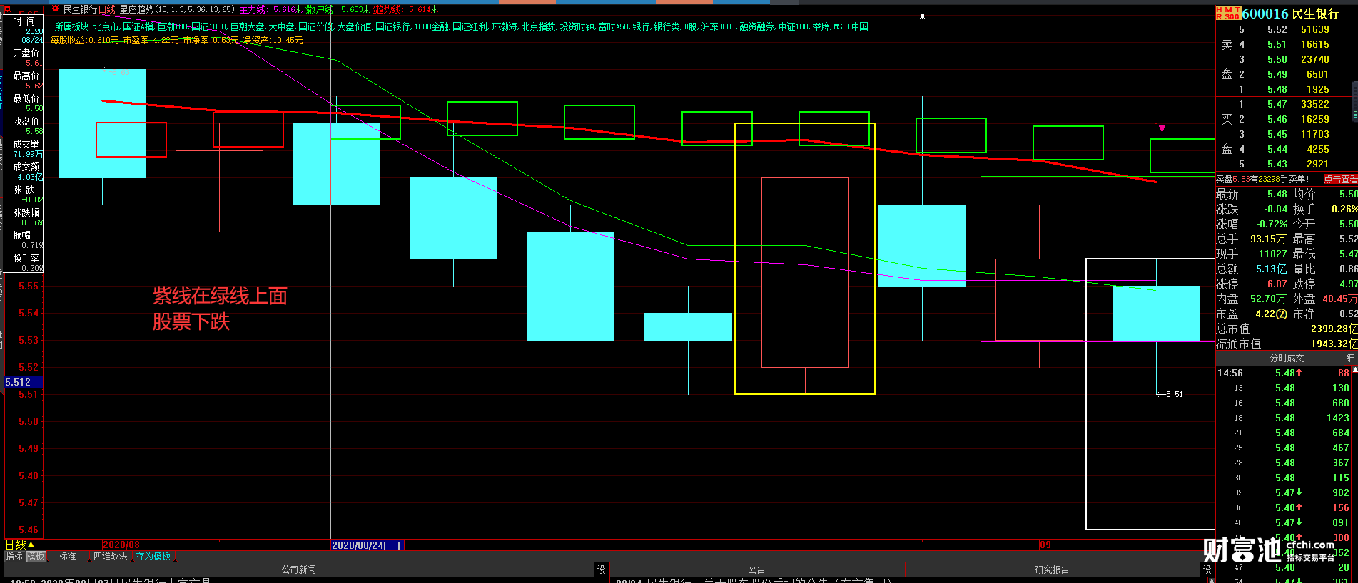 紫线代表主力,绿线代表散户。当紫线开始上扬并处于绿线上方,这代表股票会进行上涨,大胆持有。