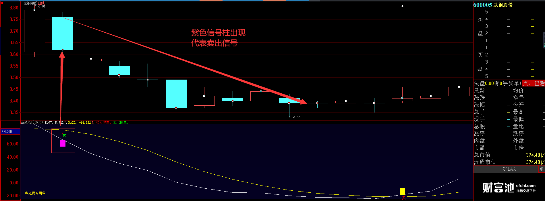 紫色信号代表卖出信号,同理看到这个信号,果断卖出。