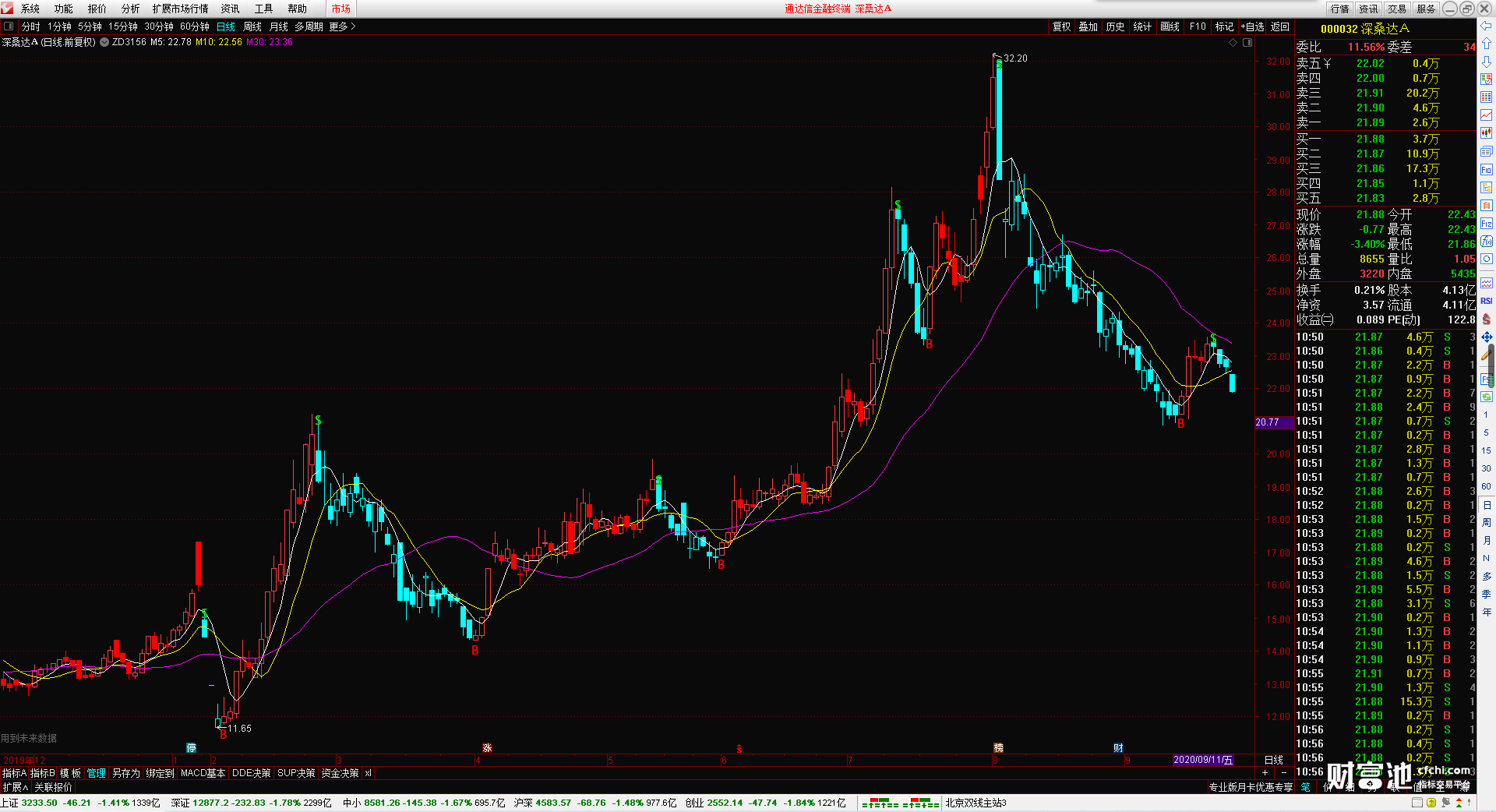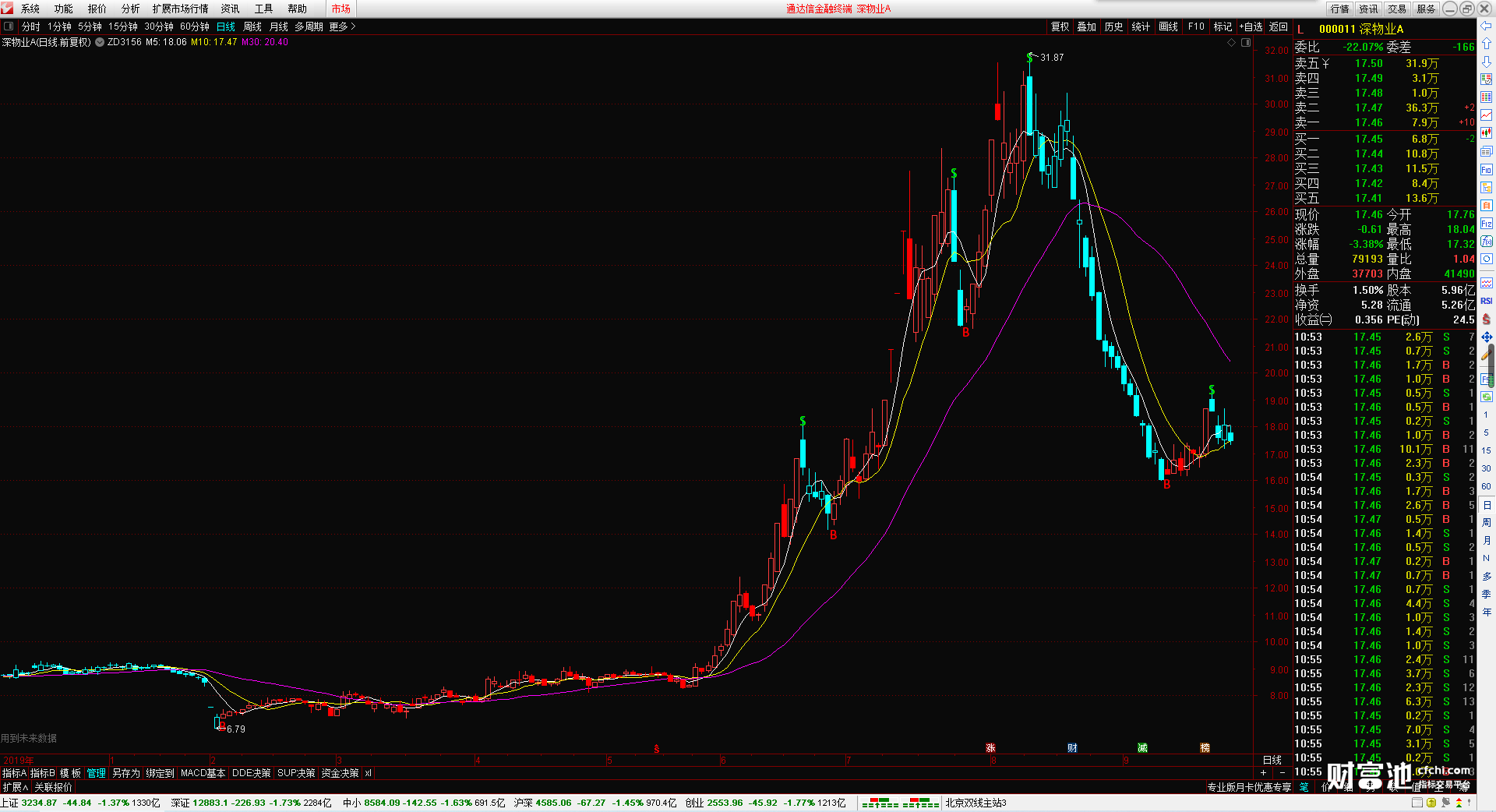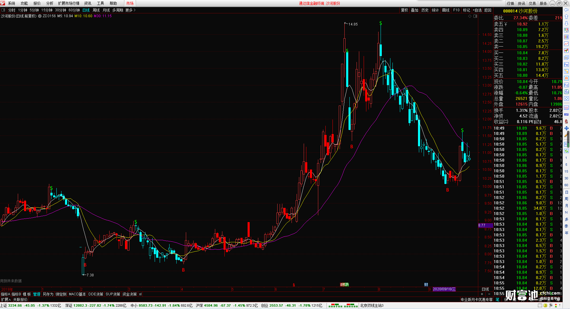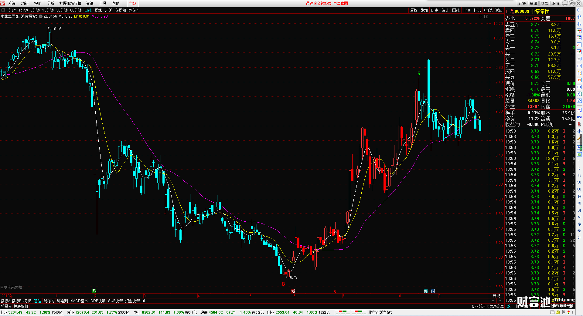 指标还带有三根均线分别是5日均线,10日均线 30日均线