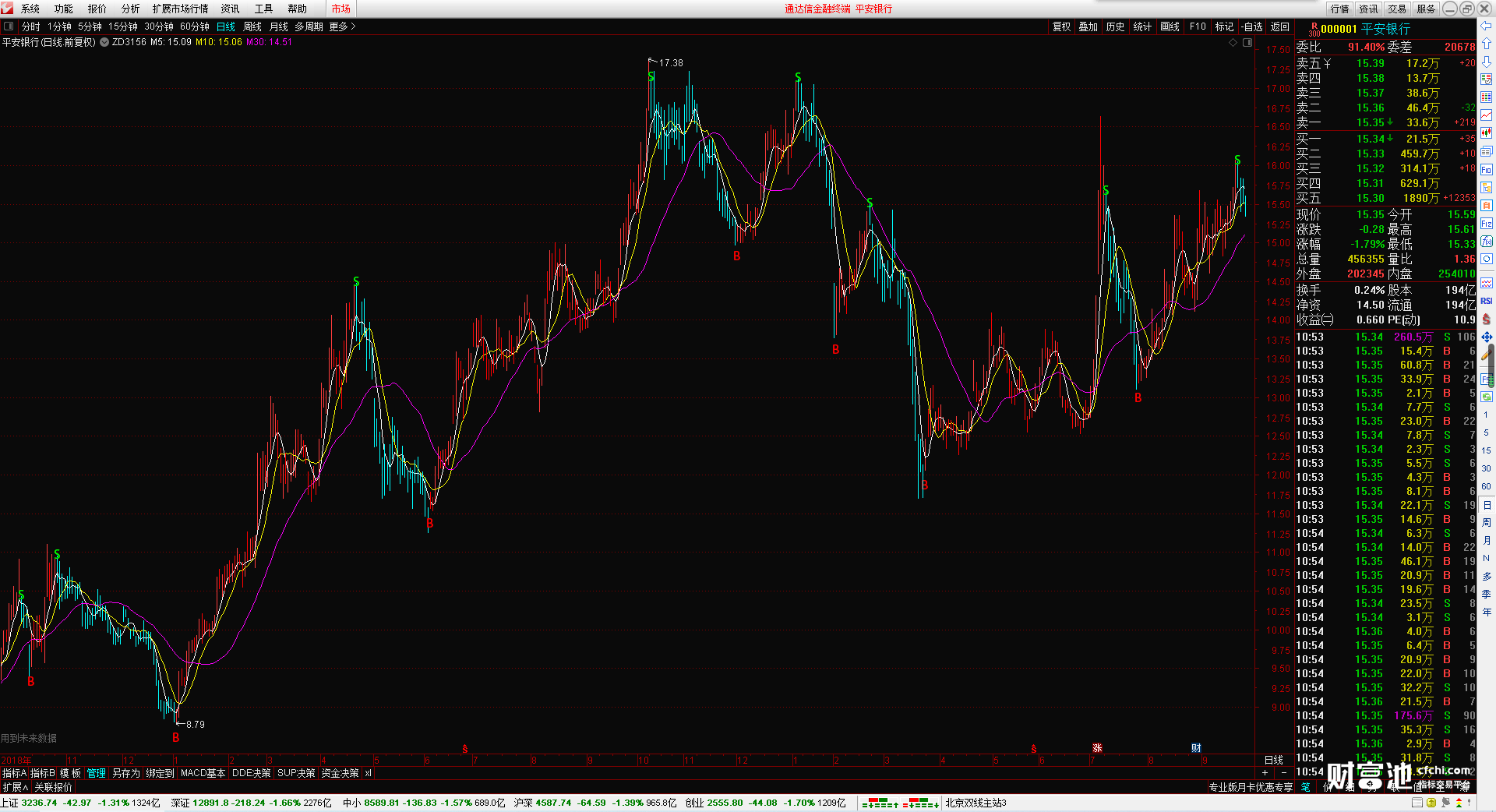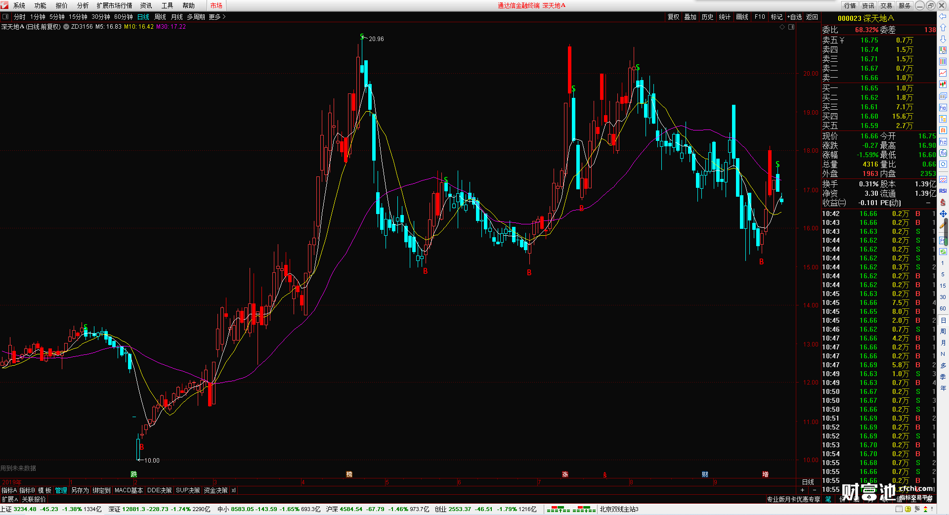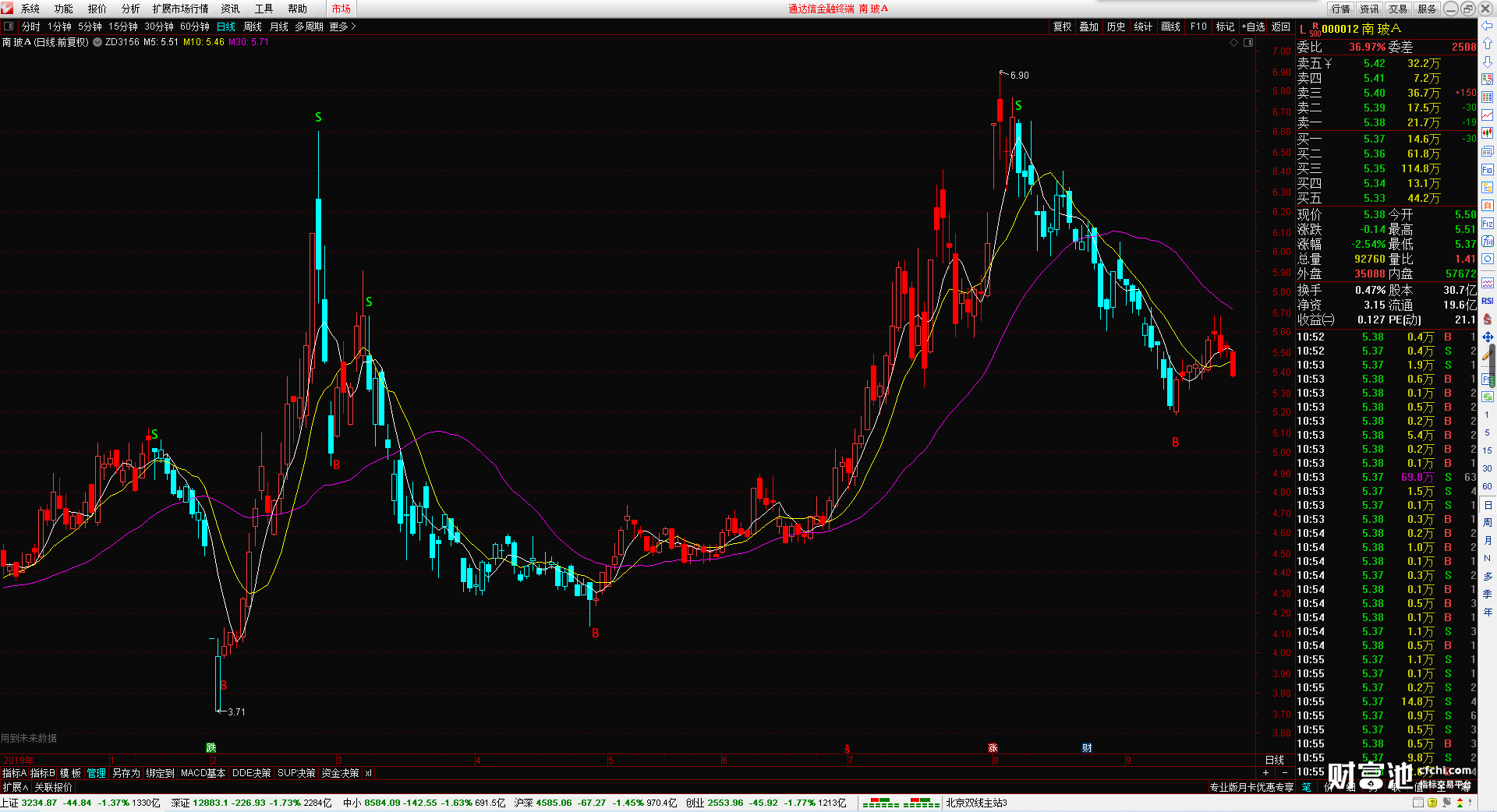 B图标为买点提示位置,S图标为卖点提示位置,多头趋势K线显示红色,空头趋势K线显示青色