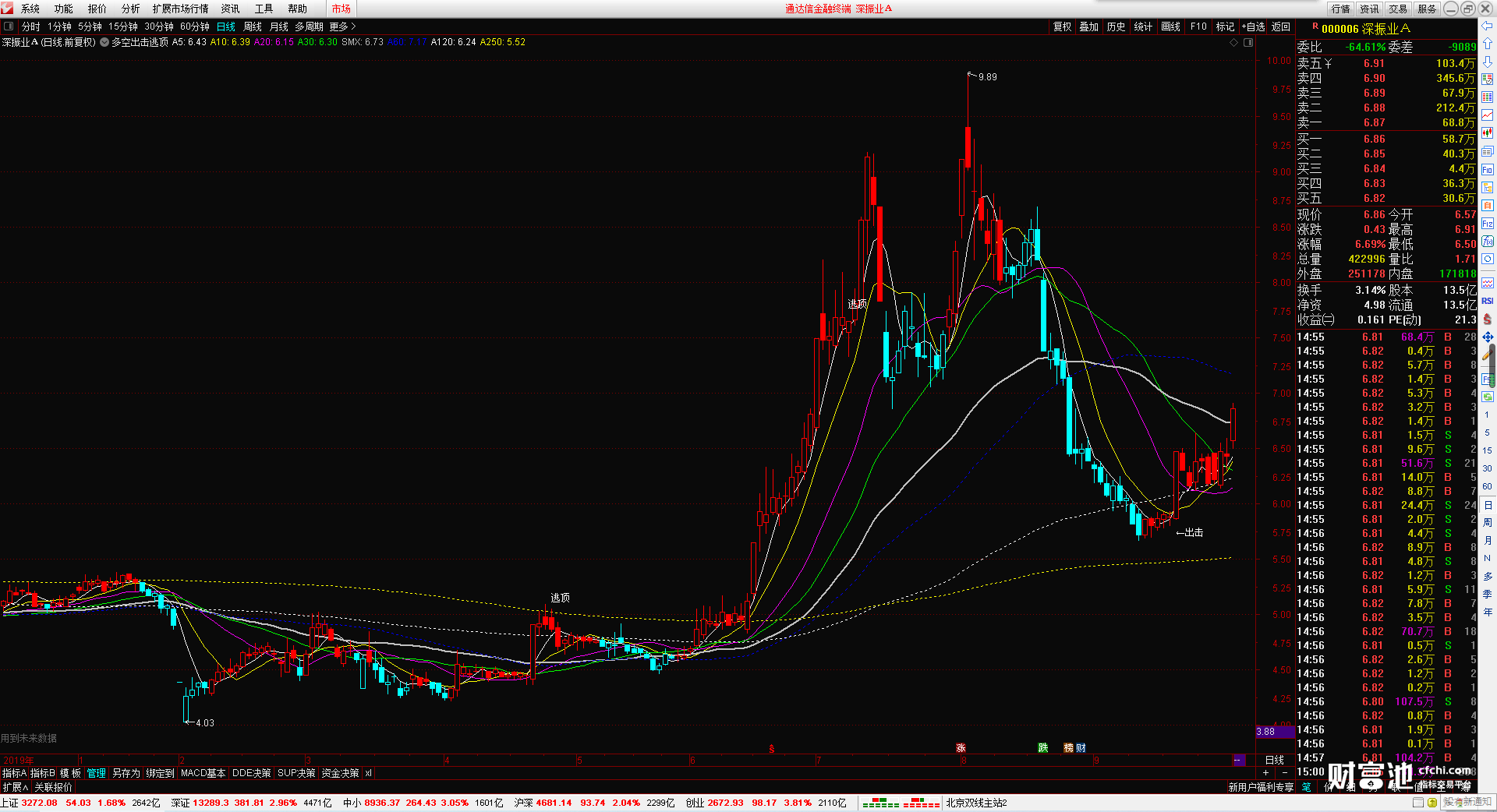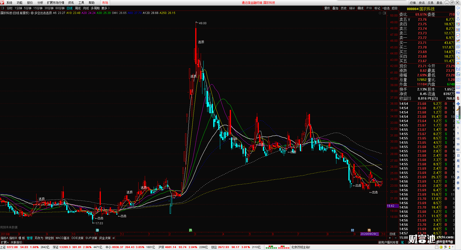 (多空出击逃顶 主图公式 无加密 无引用dll 识别多空趋势 判断阶段性顶部 出击提示)