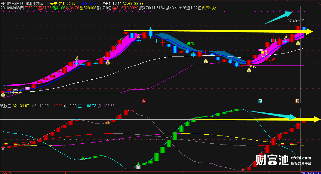 二模板‘短线强龙’主力确立上升趋势后,在一个合适的时机必然勐烈拉抬股价。 “龙头启动”信号就是主力勐烈拉抬股价开始的标志,操作重点:“主图强龙 龙头启动 强龙启动”三个信号同日出现缺一不可。一种情况出信号位置是底部放量大阳线;第二种情况是突破平台或箱体的放量大阳线;选出三信号共振个股再看附图金银财宝指标四个级别趋势都走好的优先操作,在高位出信号的个股涨幅空间有限不追涨(如下图)。筛选后的个股基本所剩无几了 再从这里面选取一两只是目前热点的 或有概念的个股操作 。主图中的白色K线 红色箭头为二次启动信号,有些个股信号共振后继续洗盘,主图发出白色K线或红色箭头信号意味着洗盘结束即将二次启动的信号,白色K线 红色箭头共振的个股重点关注。