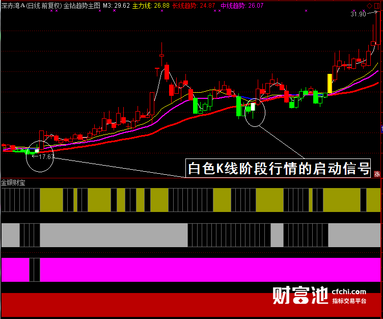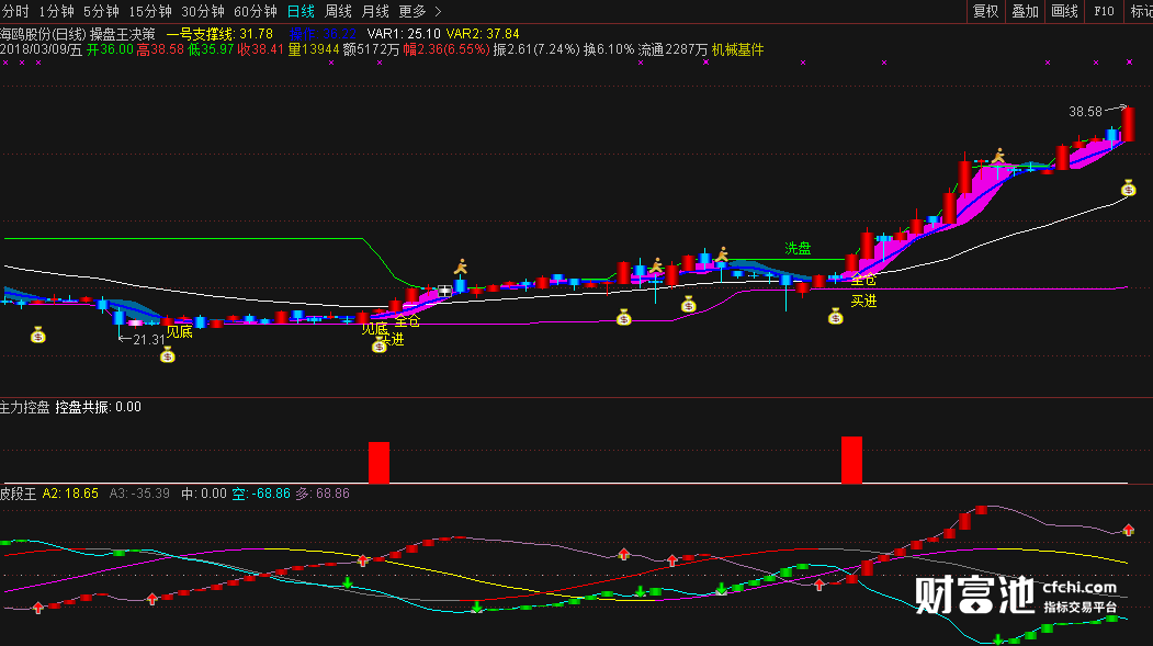三模板‘财神买卖点’绿色下跌结束,出现 笑脸K线柱变成粉色是中线起涨开始重点关注