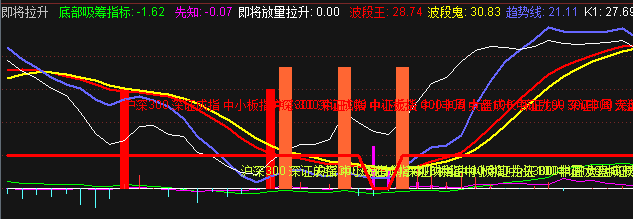 即将拉升主力筹码趋向(棕色线)进入中轴线(白色线)以下意味着进入风险区域,触及或进入主力做顶(蓝色线)以下意味着阶段顶部形成。主力筹码趋向(棕色线)进入主力做底轴线(黄色线)以上意味着行情进入底部区域,触及或进入主力做大底(粉色线)以商意味着阶段底部形成。红色立柱为抄底信号。