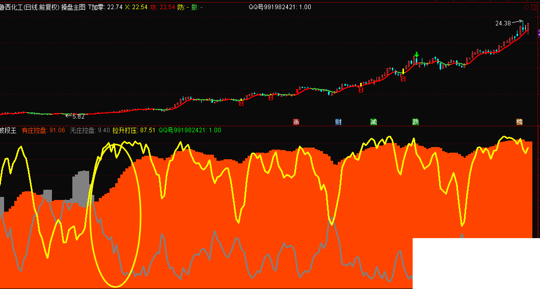 [波段王] 红线区越过绿线区是牛股,底部红线区是横盘,没啥用,它是分阶段的,不是红就可以买,红线在绿线上方是牛股,红线在绿线下方是反弹。这个指标的意义:红越过绿是主升浪。