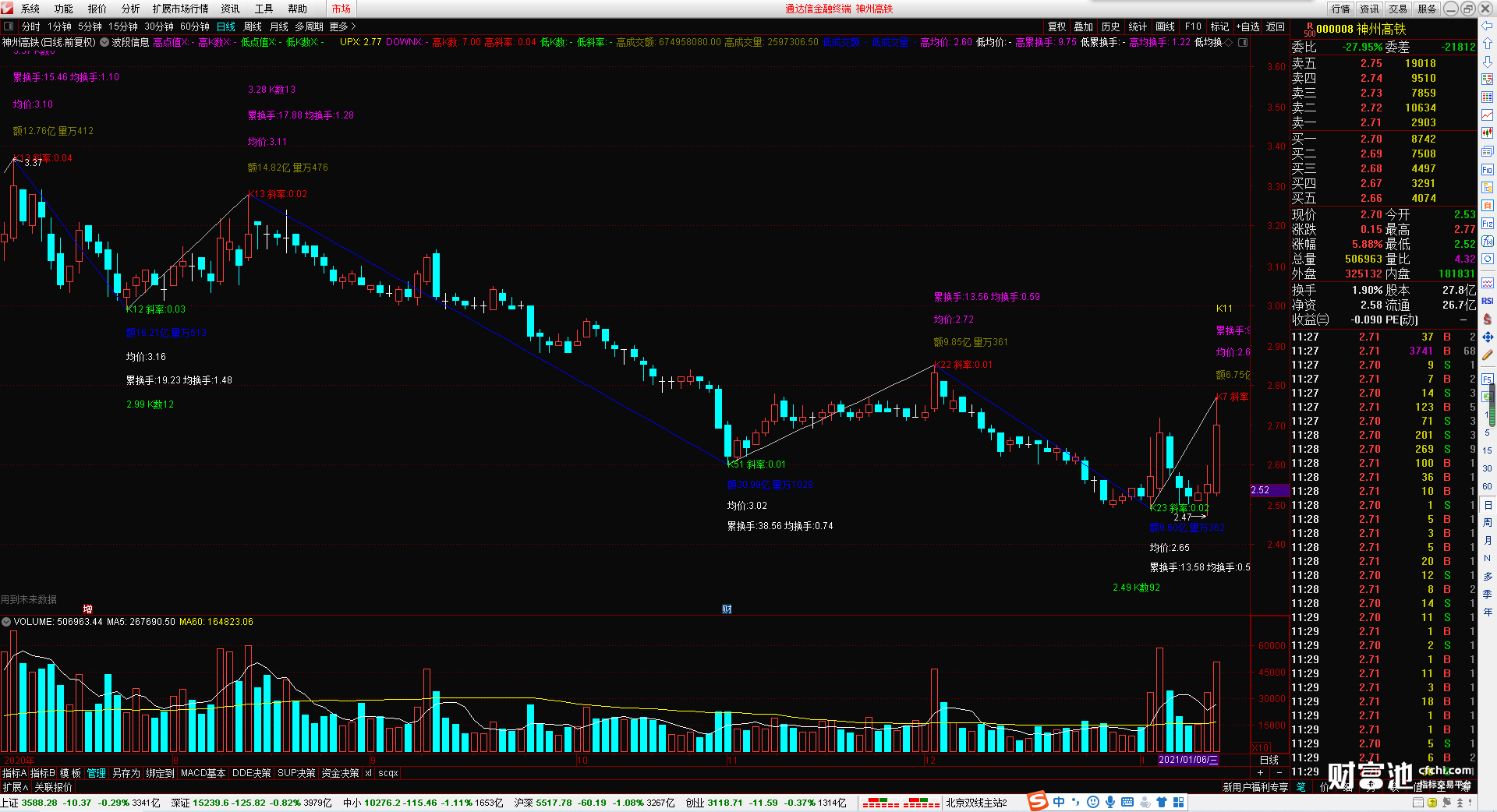 波段信息 显示波段高低点的价格 波段的k线数量 累计换手 均换手 均价 成交额 成交量 斜率