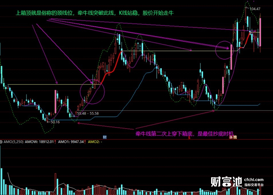 下箱底是重要支撑位,上箱顶是主要阻力位;牵牛线和K线在下箱底之下,属于极弱势,没有参与价值;牵牛线上穿下箱底,尤其是两次上穿或多次上穿后站稳在下箱底之上,是多重底或W底部突破,此时可关注抄底;牵牛线和K线在上箱顶和下箱底之间游走徘徊,是箱体震荡期;牵牛线突破上箱顶,K线站稳,俗称“颈线突破”,是最佳介入时机,股价开始走牛飙升,主升浪或许就此开启,肥美的鱼身行情就此展开。。。