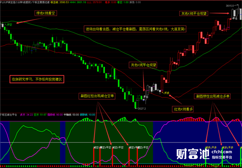 本指标通过K线颜色可以分别多空和震荡,可以把震荡盘整过滤掉!
