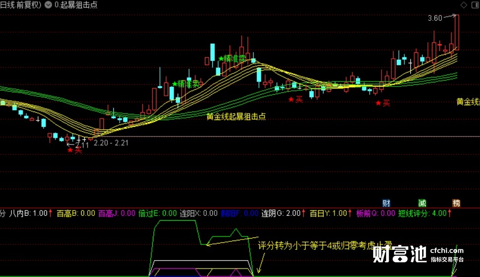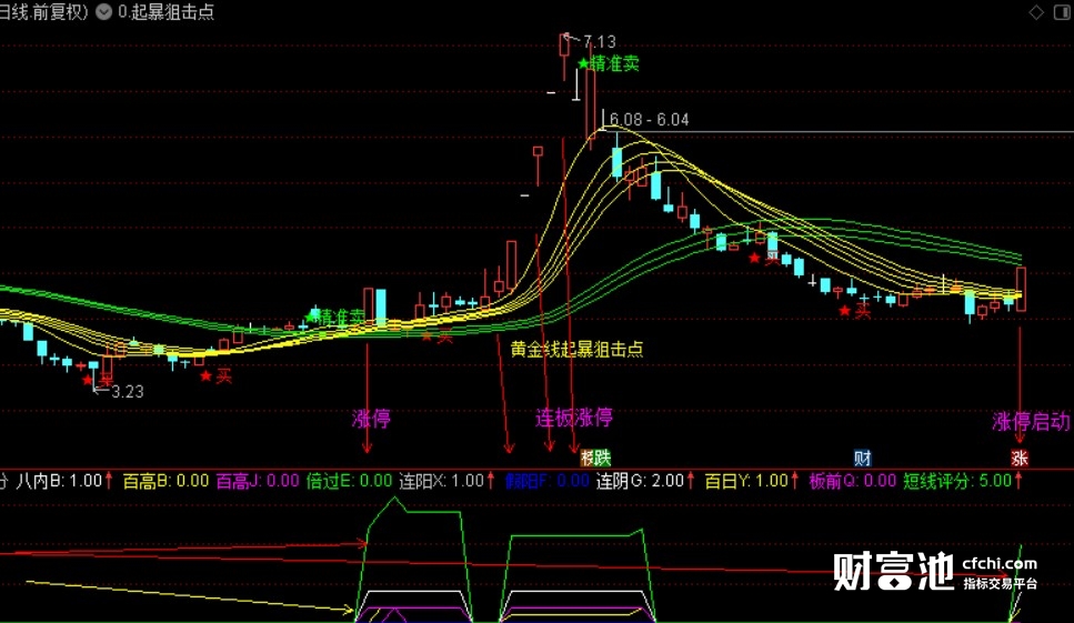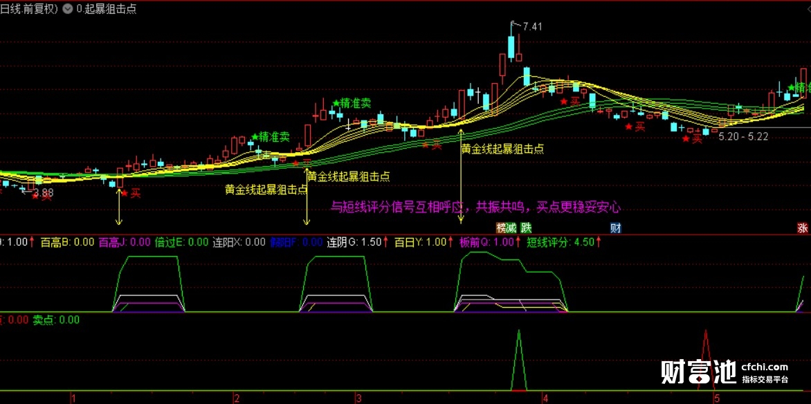 本指标由一组短期均线和一组中期均线组成,类似瀑布线或顾比均线,但又稍有不同,可以说自成体系,买卖点提示相当精准却不含未来函数;短期均线组上穿中期均线组,尤其是二次上穿,类似于MACD二次金叉出的买点提示,又可以作为波段买点提示参考;它所独有的黄金线起爆狙击点,既可以单独作为短线强势买点或小平台突破买点,又可以作为与短线评分副图共振的买点提示,效果不是一般的好哦。。。