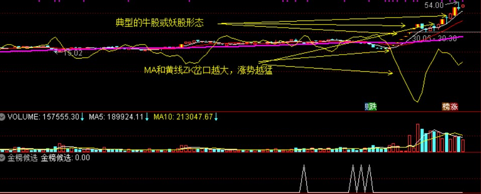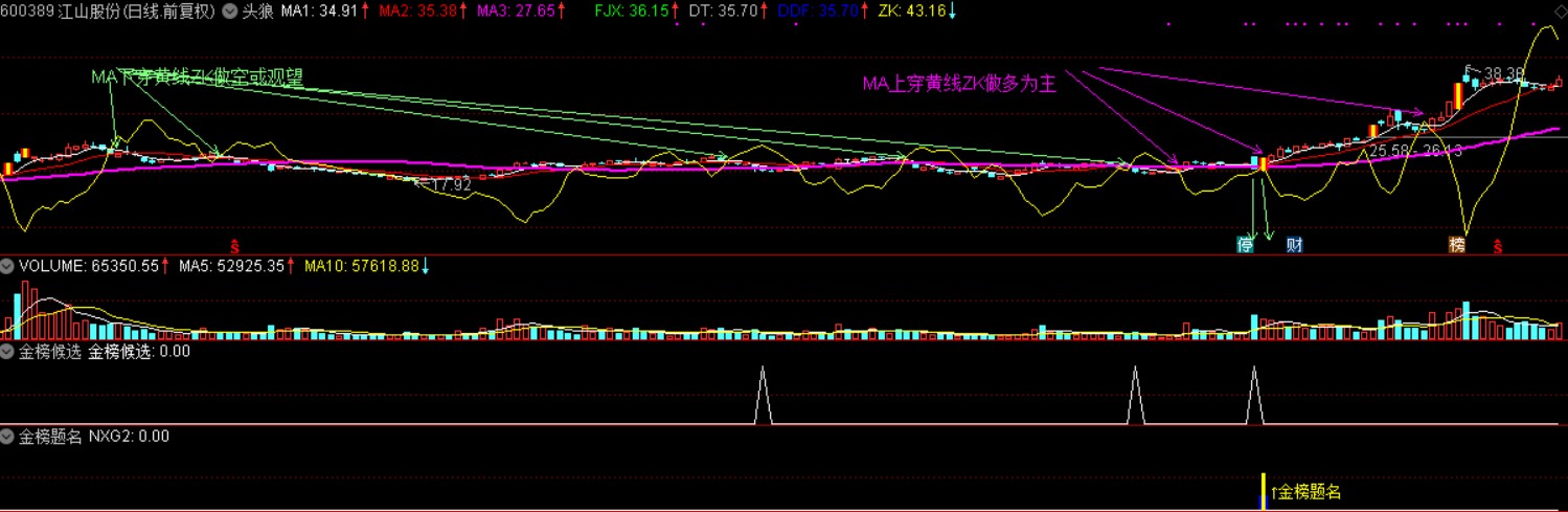 金榜题名由三个指标合成为一个指标,其中一个金蜘蛛预选是我2016年的三线穿阳指标演化而来,也是启蒙指标,当回调预选出现之后, 后面如发生 一根阳线同时贯穿 5--13--46日均线或者是 贯穿 密集的瀑布线,并且在30--60--120分钟、日线 等周期里面能够多周期同时贯穿则更佳。如首板就完成 周线级别的 一阳贯穿 5-13-46周线 ,毫不犹豫 直接可打板,当然任何模式都具有其失败率,但如不去博,不去冒风险, 怎么会有利润?
