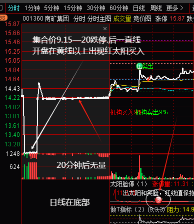 1.300开头9:40前出现太阳或者叠加‘一两个笑脸’在黄线(均价)之上,注意观察回调到均线附近下—就买入。 红线值越大越能涨停(11以上),涨幅3%—6%以一定能涨停。 2.结合集合竞价走势(9:15—9:20涨停.9:20到25一条直线,上边无量,下边逐渐充满三.四格红色放量.或者三条直线.上下无量)—必涨停。 3.主板出现红太阳叠加笑脸时,红线值必须在保持15之上——买入(数值越大涨停概率越大)。