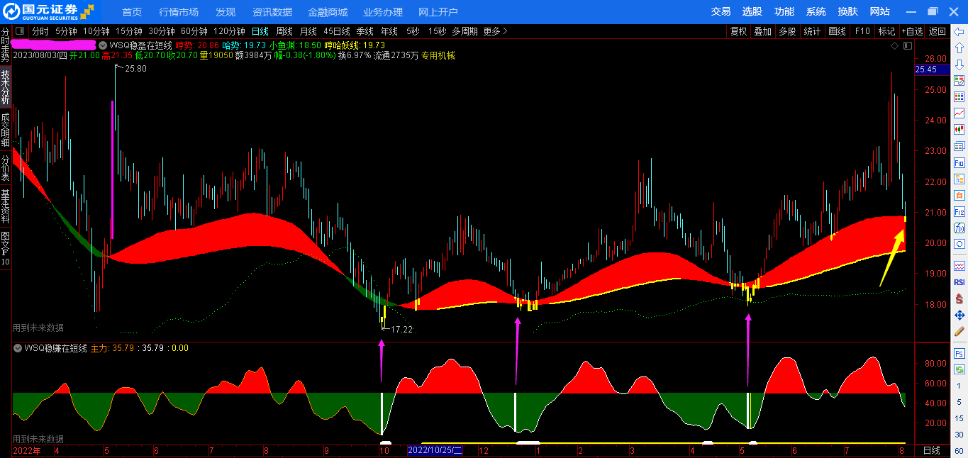今日实战的思考:副图没有出现可买入信号,但是,当前主图黄色箭头指向处,暖气流带之上,出现了“黄金坑”,好像机会就在眼前,预期短线获利3%-10%,还是大有希望的,4-5成仓操作,如果继续走低,再补仓一次,一般10个交易日内即可实现预期获利目标。
