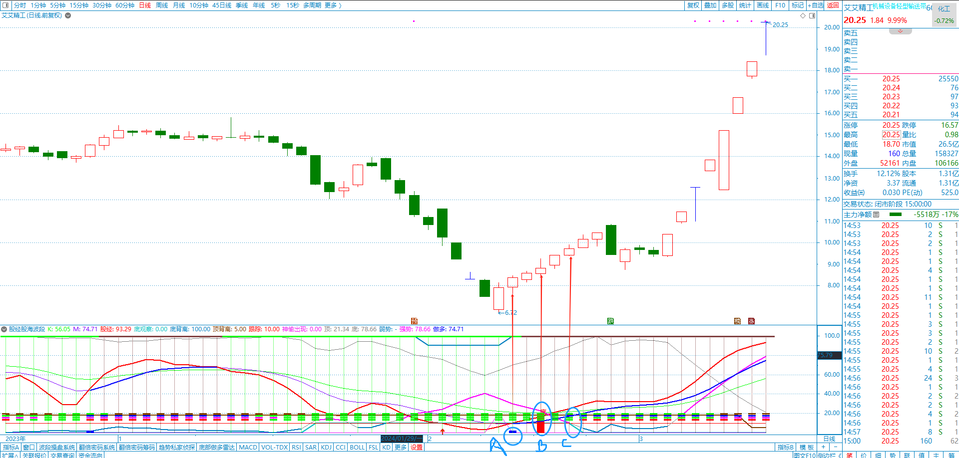 .副图指标大幅波动的三条线,分别是绿色K线,红线-股经,另外一条为“M”线,依次金叉时进场做多,三线顺上则顺势做多或波段持股。