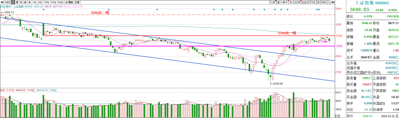 指数方面,市场横盘整理了一周:周一到周四,沪指在3050点上方震荡了4个交易日,两度上攻3090点,但始终未能收复3100;周五在离岸人民币大幅调升的利空影响下,沪指自2635点探底反弹以来首次回踩20日均线。整个3月,沪指都维持在 3000-3100点区域内运行,周五的调整作为正常的技术性回踩看待。周末影响市场走势的消息面因素也不多,美股三股指涨跌不一,热门中概股普跌,纳斯达克中国金龙指数跌1.80%。周一,指数开盘后大概率还有一个惯性弱势的过程,但市场要维持强势运行势必会坚守住3000点整数关口。如果指数彻底失守20日线,那么趋势就开始转弱,短期突破3100点预期就不大了,因此明后天是关键,一是看20日均线支撑,二是看3000点的支撑: