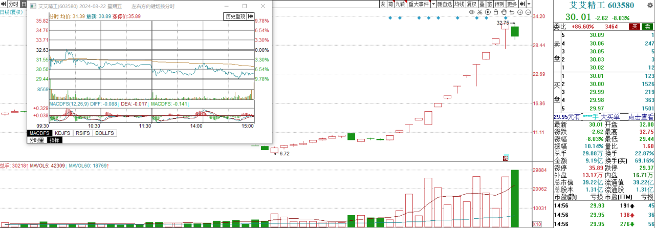 市场情绪方面,两市最高连板股艾艾精工周五正式见顶结束了,止步13连板,与上一只连板人气龙头克来机电高度相同。克来机电春节前2月1日启动首板,2月28日结束连板,市场情绪出现第一次分歧和回落;2月29日市场情绪修复,资金切换至以高新发展为代表的趋势人气股炒作。3月6日,克来机电涨停,市场情绪迎来第二波炒作预期,然而次日克来机电高开低走杀跌停,市场情绪出现第二次分歧和回落,3月8日两市连板股高度也下降至4连板。与第一次情况相似,之后资金炒作情绪仍未彻底熄火,主线AI依然活跃,人气股则由高新发展切换为工业富联再到天孚通信、中际旭创。而与此同时,连板股也开始向上打出高度,3月11日安彩高科,3月12日、13日立航科技,3月14日艾艾精工正式脱颖而出晋级8连板,随后连续向上打出高度,指本周三和周四达到情绪高潮。中午,艾艾精工见顶结束,大理药业、永悦科技、立航科技、宏达新材等一众个股都开始出现“核按钮”跌停效应,人气股坑人效应放大,宣告市场情绪开始进入退潮阶段。