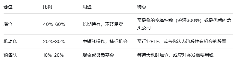 对于新手来说,不需要太复杂的模型。你可以把资金简单分成三份: