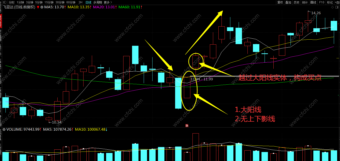 第一根大阳线出现后的第二个交易日,若股价继续放量上涨,越过大阳线实体,则构成买点。