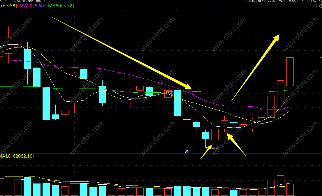2、该形态出现之后,伴随着股价的上涨,成交量会明显放大。