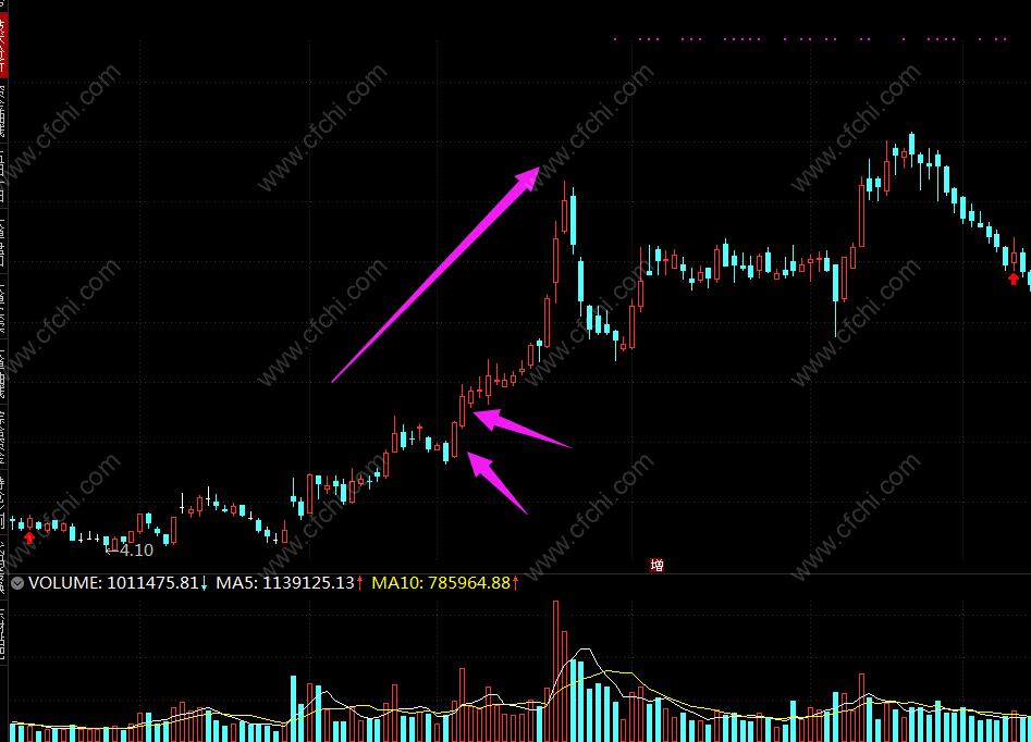 2、股价在缓慢上涨的过程中,突然出现一根大阳线,同时伴随着成交量的显著放大。
