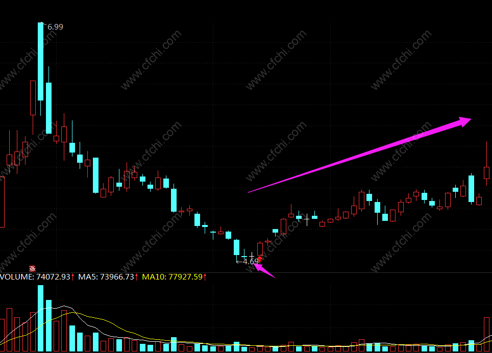 低位十字星为市场行情反转的信号。在下跌行情中,空方一直占据主动。如果这时出现十字星,表示多空双方陷入僵持。之前空方推动的上涨行情已经结束,市场将在多方的推动下出现一波上涨走势。