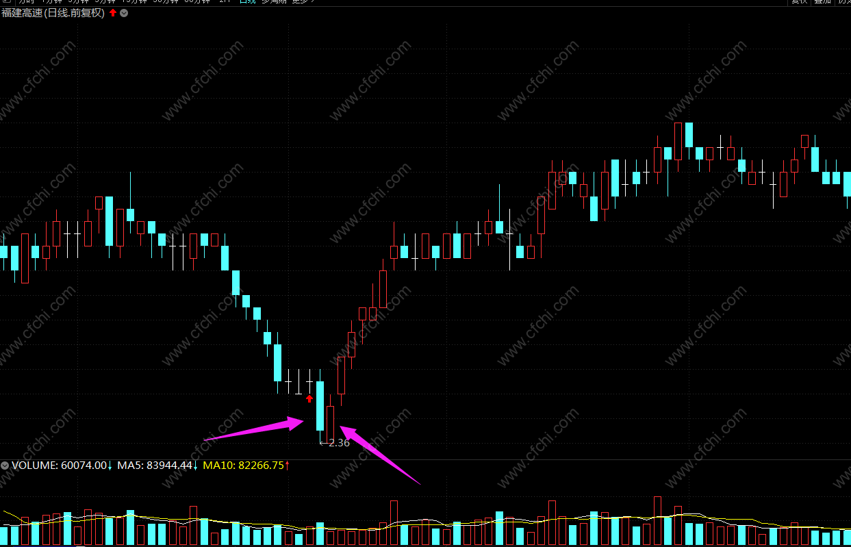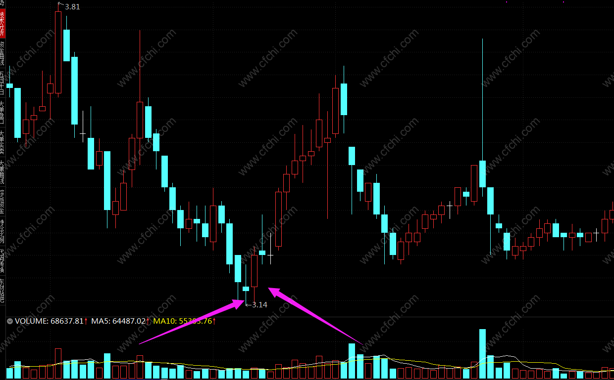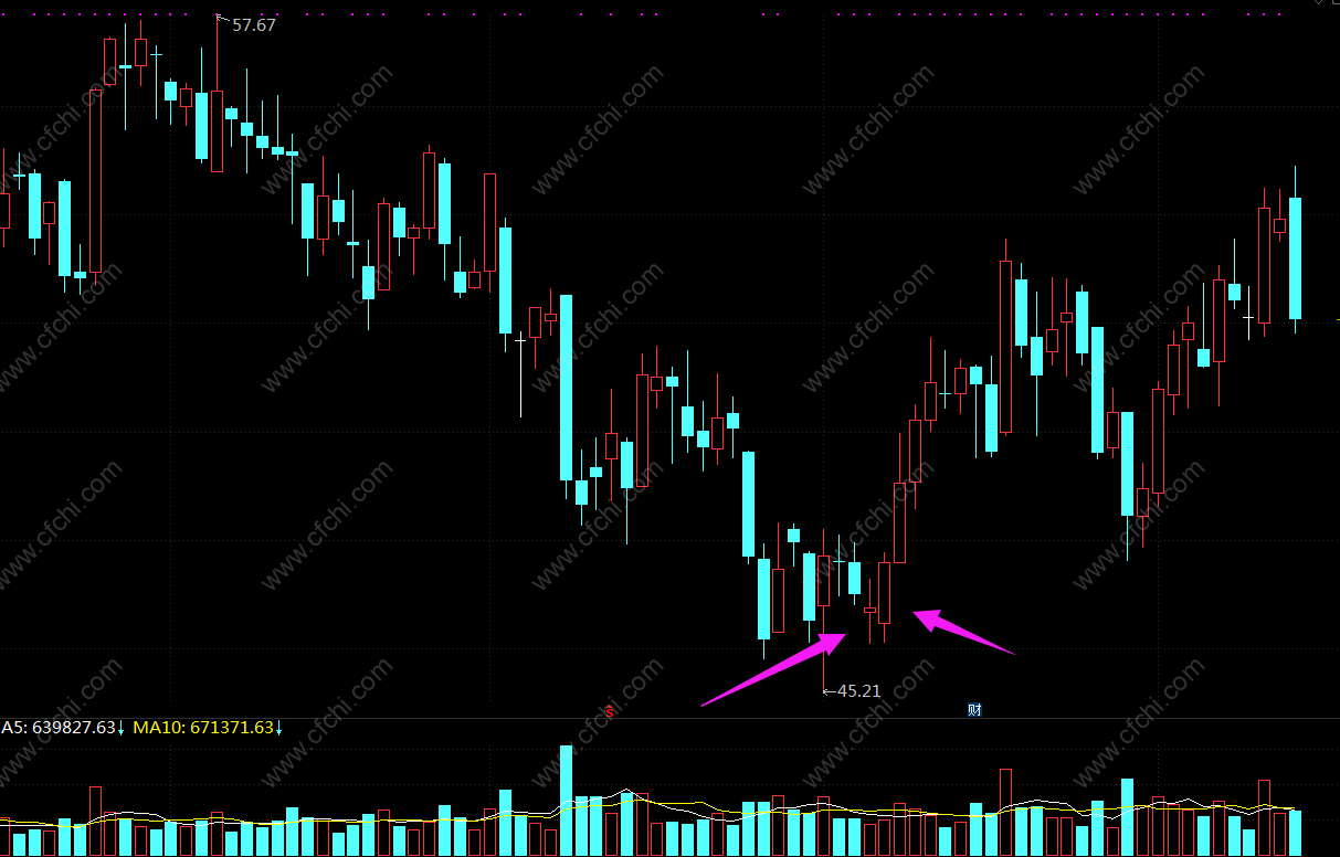 3、该形态形成的时候,股价仍处于下跌走势中,成交量较低,之后伴随着股价的上涨,成交量将逐步增大。