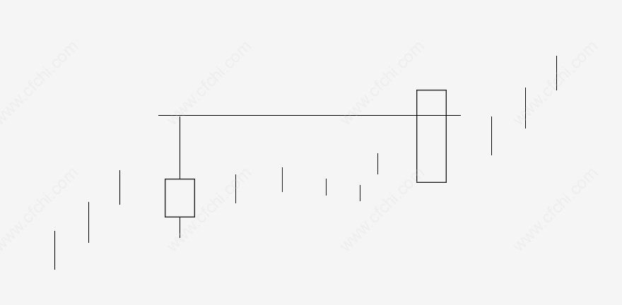 2、经过一段时间调整后,出现一根中阳线或者大阳线。该阳线的收盘价超过第一根K线的最高价。
