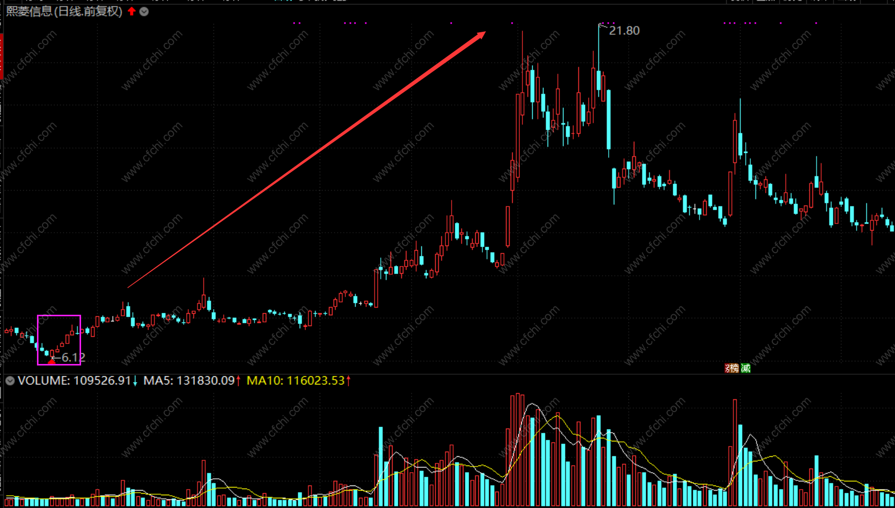 4、如果在连续五根小阳线后紧接着有一根放量的中阳线或者大阳线突破,则该形态的看涨信号大大增强。