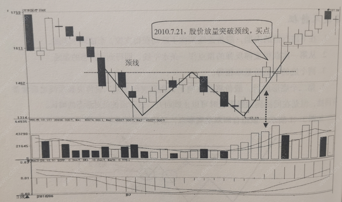4、第二个底形成后,股价将再次向上,放量突破颈线。股价突破颈线之后常常有回抽,但是在回抽到颈线附近时可以止跌回升。这种回抽时对形态的确认。