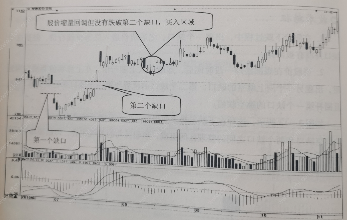 2、当股价在底部整理一段时间后,逐渐进入上涨行情。在上涨到前期缺口附近时,出现另一个向上跳空的缺口。第二个缺口的位置与第一个缺口的位置基本相同,且回补第一个缺口的跳空跌幅。