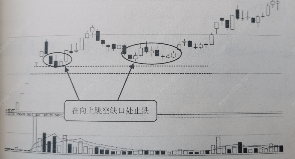 2、向上跳空缺口出现后,股价冲高回落,但无法回补缺口,股价在缺口处止跌;