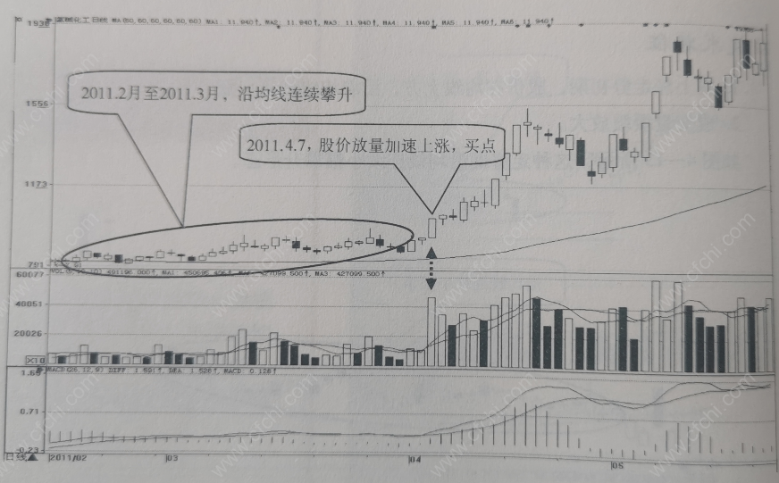 沿均线连续小幅攀升出现后,若股价出现放量加速上涨态势,则买点出现。