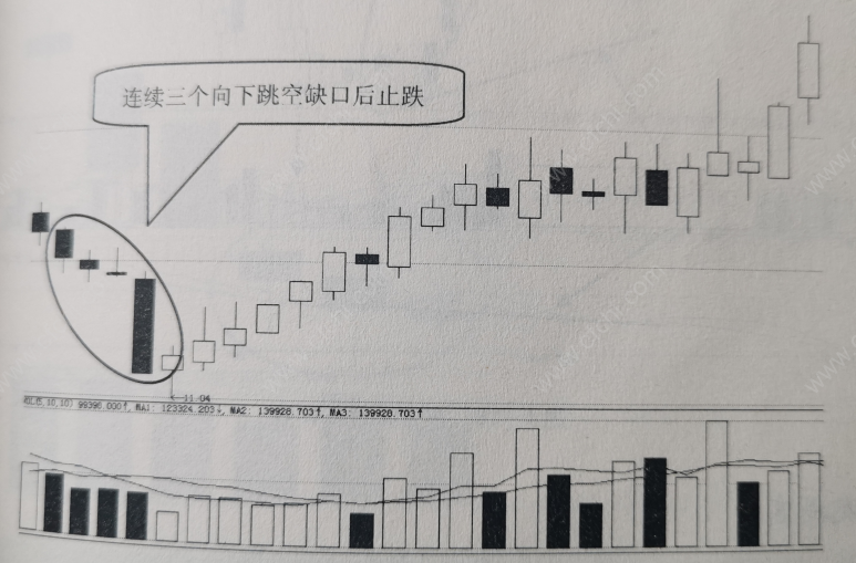 1、在下跌走势中,连续出现三个向下实体跳空缺口,之后股价止跌回升;