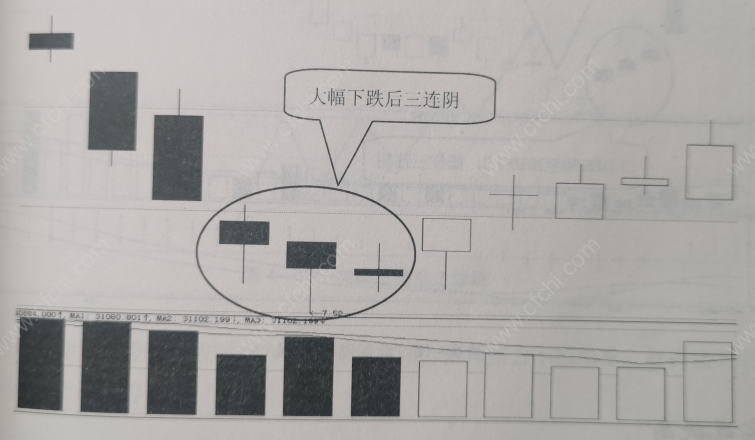 1、在下跌走势中,首先出现一波加速下跌走势,之后股价在低位连续出现三根阴线;