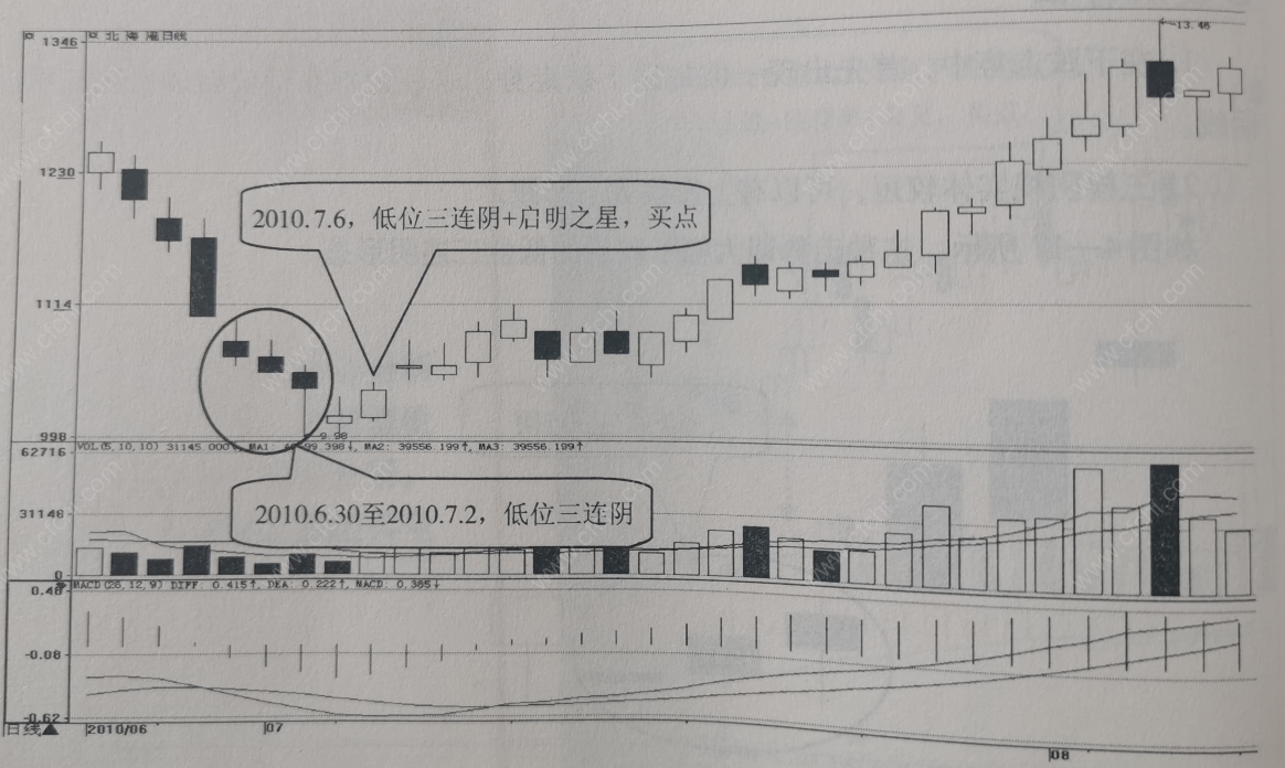 大幅下跌后的低位三连阴,表明市场下跌动能正在削弱,上涨动能正在逐步积聚,股价接下来有较大可能出现一波上涨走势。