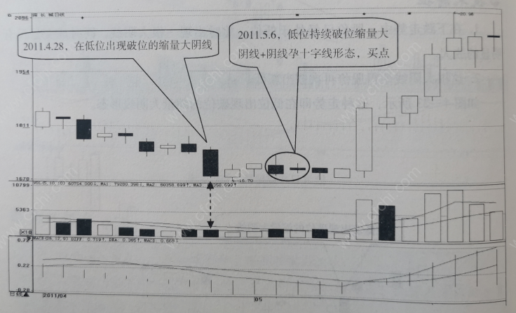 1、在下跌走势中,股价已经处于低位,此时出现一根大阴线,同时成交量没有明显的放大;