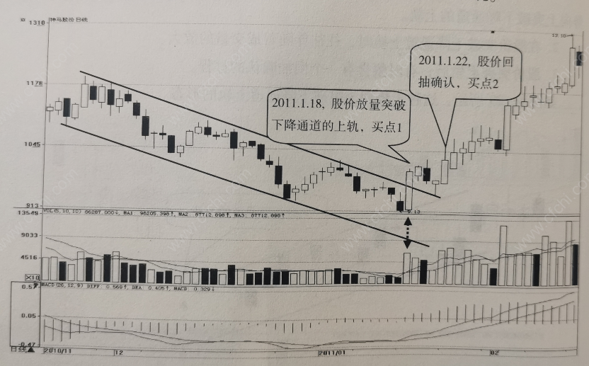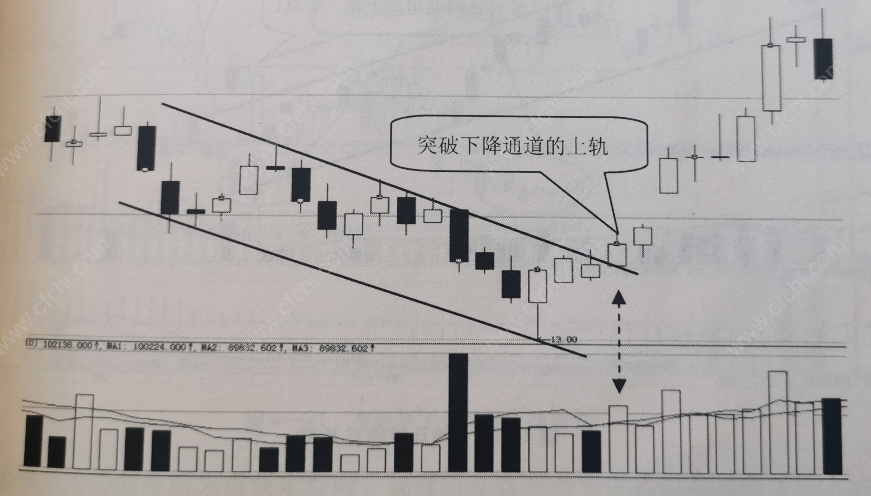 1、在下跌走势中,股价在下降通道中涨跌互现,成交量也不断缩减。之后,走势向上突破下降通道的上轨。